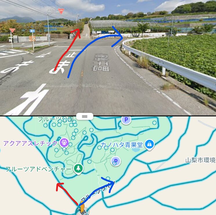 グーグルマップで検索すると、最短距離の赤方面に案内されます。